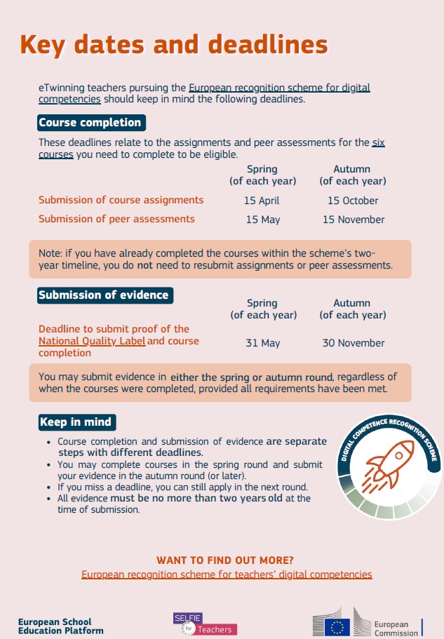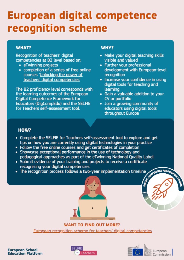 Európska komisia spustila systém uznávania digitálnych kompetencií učiteľov - European recognition scheme for digital competencies. Cieľom je, aby úsilie a angažovanosť učiteľov pri projektovom vyučovaní a profesijnom rozvoji boli viditeľné nielen v triede alebo škole, ale aj v profesijnom portfóliu učiteľa pri jeho kariérnom raste.