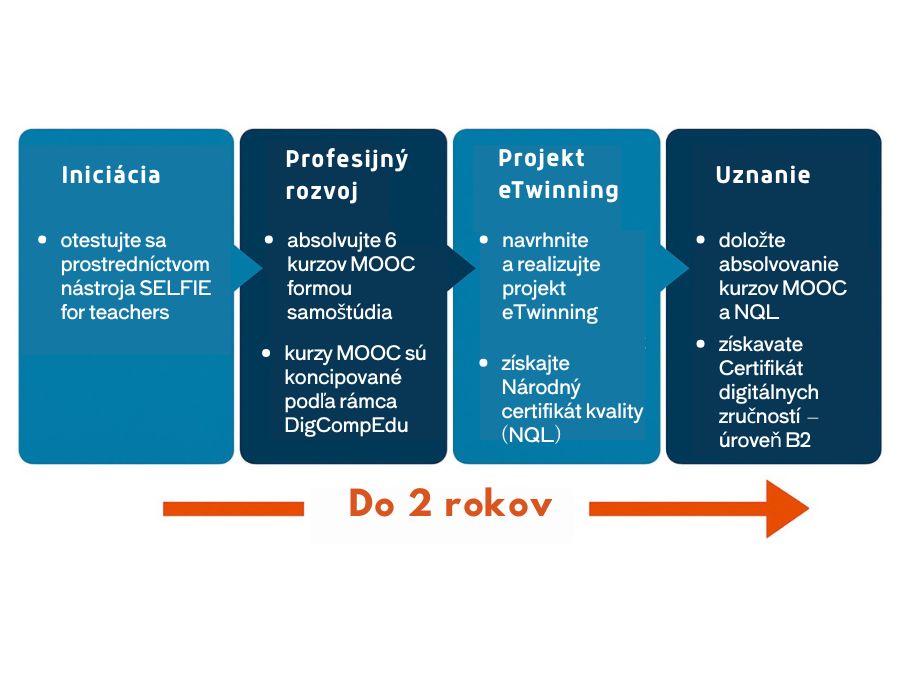 Dosiahnutie úrovne B2 znamená, že digitálne kompetencie sú v súlade s európskym rámcom digitálnych kompetencií učiteľov DigCompEdu a nástrojom SELFIE for Teachers.